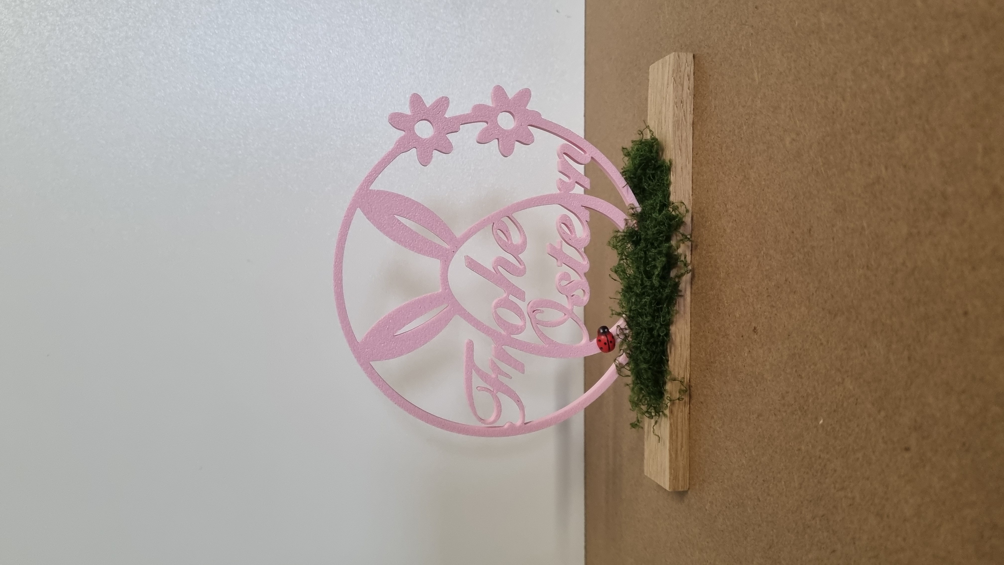 Der Aufsteller „Frohe Ostern“ vereint moderne Leichtigkeit mit klassischer Osterfreude. Die filigrane Schrift, eingebettet in eine runde Form mit stilisierten Hasenohren und floralen Details, wirkt verspielt und zugleich elegant. Der natürliche Holzsockel mit feinem Moos und kleinem Marienkäfer setzt einen warmen, frühlingshaften Kontrast zur zarten Farbgebung.