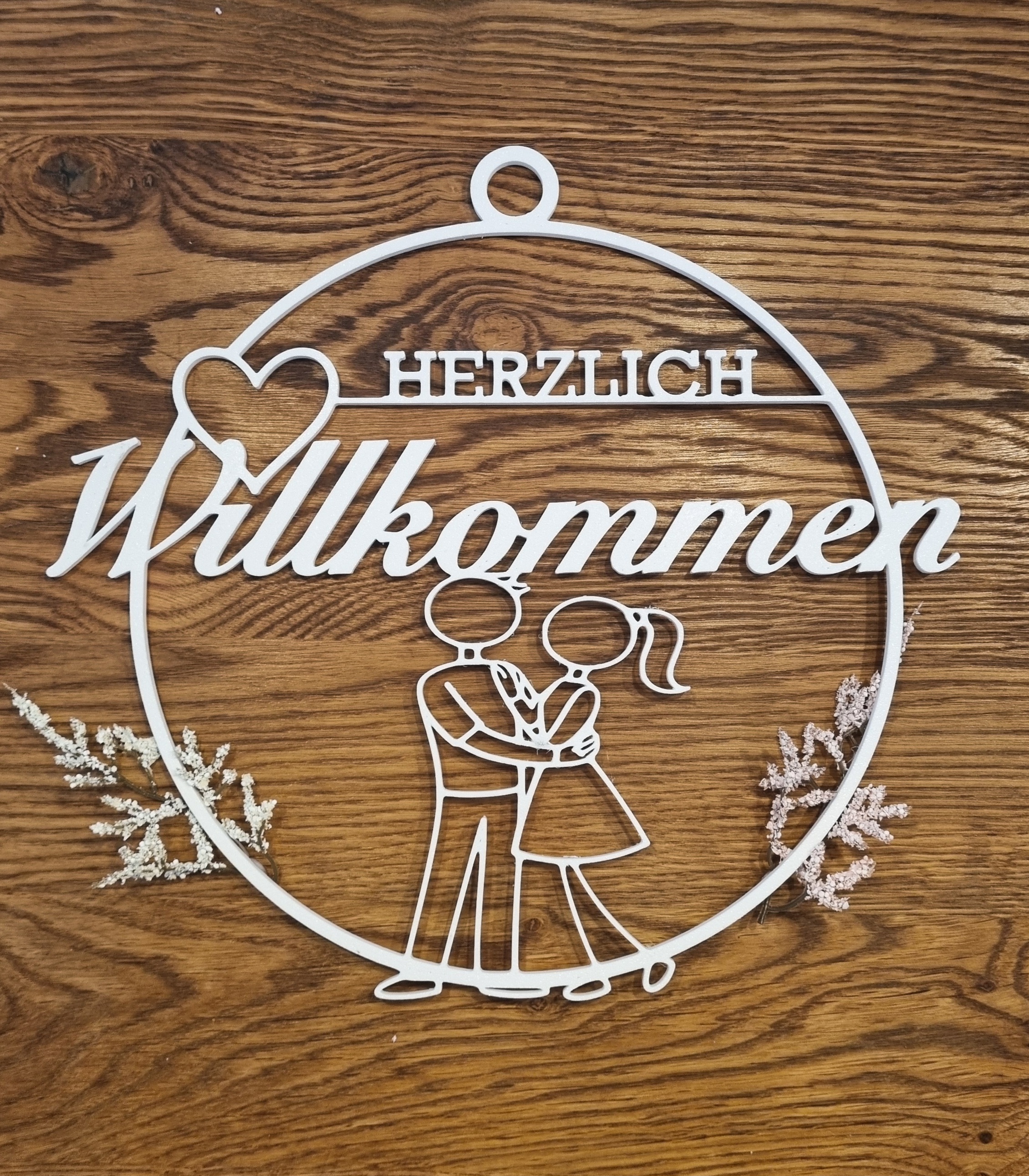 Der Türkranz „Paar“ heißt Gäste auf besonders warme und persönliche Weise willkommen. Im Mittelpunkt stehen Mann und Frau, eng verbunden und harmonisch dargestellt – ein Symbol für Zusammenhalt, Liebe und gemeinsames Ankommen. Die filigrane Linienführung der Figuren und der geschwungene Schriftzug „Herzlich Willkommen“ verleihen dem Kranz eine moderne, zugleich emotionale Ausstrahlung.